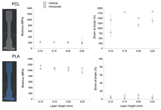 In addition to the evaluation of the internal/external pore formation using the combination of SCCO2 and breath figures, the mechanical properties of standardized specimens printed using PLA, PCL, and a mixture of both was investigated. First of all, the mechanical properties (modulus and strain at break) of horizontally and vertically printed specimens for both PLA and PCL were analyzed using different layer thickness (from 0.1 to 0.25 mm) (top and middle of Figure 7). Interestingly, these two materials present completely different properties. PCL-printed parts present a very low modulus of around 200 MPa, and this range of values appears to be similar for both printing orientations. In contrast to this low modulus, the strain at break of PCL-printed parts is rather high with values of up to 1700%. In this case, slight differences were observed between the two different printed orientations. It appears that horizontally printed specimens present a higher strain at break in PCL samples. In the case of PLA, slight differences were observed depending on the printing direction. While the modulus of the specimens printed horizontally remain constant for the layer thicknesses evaluated, the vertically printed parts presented moduli that decreased with the layer thickness from 1200 MPa down to 900 MPa. However, independently of the slight differences observed, the moduli measured are around 5 times higher than those measured for PCL. Concerning the strain at break, the PLA specimens present values of less than 10%.