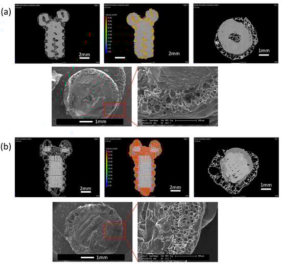 Micro-Computerized Tomography (CT) (above) and SEM (below) cross-sections of illustrative examples in which the samples present a solid internal structure and a porous area limited to the surface layers. (a) Screw fabricated in PCL with porous surface. (b) Screw with an internal PLA solid structure and a porous PCL external layers.