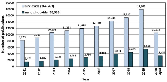 The number of scientific publications referring to the search of “zinc oxide” and “nano zinc oxide” phrases published in the period of 2011–2020. Source: ScienceDirect (accessed on 19 April 2020).