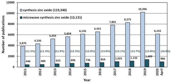 The number of scientific publications referring to the search of “synthesis zinc oxide” and “microwave synthesis zinc oxide” phrases published in the period of 2011–2020. Source: ScienceDirect ScienceDirect (accessed on 19 April 2020).