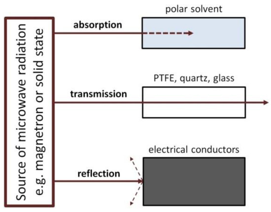 The interaction of the microwave radiation with a substance may be divided into three types (Figure 8): absorption, transmission and reflection. Polar substances (e.g., solvents: H2O, ethylene glycol) absorb microwave radiation, as a result of which they are heated. Non-polar substances may display low interactions with microwave radiation, for which they are a microwave transparent medium. The third type includes substances (electrical conductors, e.g., metals) which reflect the microwave radiation from their surface.