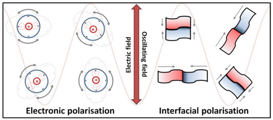 Dielectric heating schematic illustration of the electronic polarisation mechanism (movement of charges in the microwave field) and the interfacial mechanism (accumulation of charges on the interface between two different surfaces).
