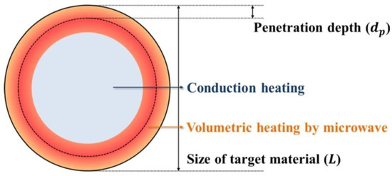 where —penetration depth (cm), —wavelength at vacuum conditions (cm), —magnetic permeability of free space (H·m−1), —magnetic relative permeability (H·m−1), —permittivity in free space, (F·m−1), —relative permeability (F·m−1), and —loss angle. If considering, e.g., water, the penetration depth of the electromagnetic radiation with the frequency of 2.45 GHz at the temperature of 25 °C for deionised water is 2.88 cm, while for water with an addition of NaCl (0.5 M)—merely 0.45 cm [456] (Table 3). When the size of the heated substance is greater than the microwave penetration depth, only a part of the volume of this substance is heated, which is illustrated in Figure 12.