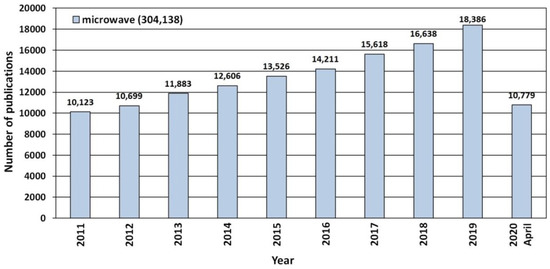 Microwaves constitute the part of the electromagnetic spectrum with the wavelength (λ) between 1 mm and 1 m (Figure 7), which corresponds to the frequency range between 300 MHz (λ = 1 m) and 300 GHz (λ = 1 mm) [420,421]. Generally, microwaves are commonly used for commercial and military purposes, namely in cellular, Internet, and satellite communications, in radar technologies (radiolocation and radio navigation) and in the food industry (heating and drying). The International Telecommunication Union (ITU) [422] introduced the official division of the microwave range by frequency for the first time in 1953 [423,424]. ITU periodically organises World Radiocommunication Conferences (WRC) [425], during which legal radio regulations, i.e., international agreements controlling the use of the radio frequency spectra, are reviewed and corrected as necessary. In accordance with international agreements, some frequencies were assigned for industrial, scientific and medical purposes to avoid interferences in telecommunication. In each country, a dedicated governmental department deals with the assignment of frequencies and the frequency range as well as the terms and conditions of their use; in Poland, this role is fulfilled by the Ministry of Infrastructure [426]. The division of frequencies for industrial and scientific purposes is presented, e.g., by Torgovnikov [427]. Given the fact of the frequent use of microwave radiation in telecommunication, its individual frequencies were assigned to specific fields, e.g., microwave ovens and equipment employed at a laboratory were assigned the frequency of 2.45 GHz, which corresponds to the wavelength of ca. 12.25 cm.