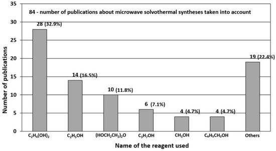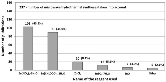 Nowadays, when the humans are fully aware of their harmful environmental impact [403,404] and of the climate change on the planet [405], particular attention is drawn to technologies of obtaining such nanomaterials that are environment friendly. One of the most interesting dynamically developing “green technologies” of ZnO nanostructure syntheses is the “microwave assisted synthesis”, which is proved, e.g., by the constant trend of the growing number of publications concerning microwave synthesis of ZnO (Figure 6). At present, the number of scientific papers describing the microwave synthesis of ZnO accounts for ca. 10.9% of the number of all hitherto published papers describing the synthesis of ZnO, while the annual percentage share in 2020 was as high as ca. 16.0%. It must be noted that microwave synthesis is also commonly and willingly employed for obtaining different nanomaterials, e.g., gold (Au) [406,407], silver (Ag) [406,407,408], rhodium (Rh) [406,407], copper (Cu) [406,407], hydroxyapatite (HAp) [409], zirconium dioxide (ZrO2) [410,411,412], titanium dioxide (TiO2) [413], silicon oxide (SiO2) [414], cerium dioxide (CeO2) [415], tin oxides (SnO and SnO2) [416], and nanocomposites (i.a. ZrO2-AlO(OH) [417,418], MoS2- polydopamine-Ag [419]).