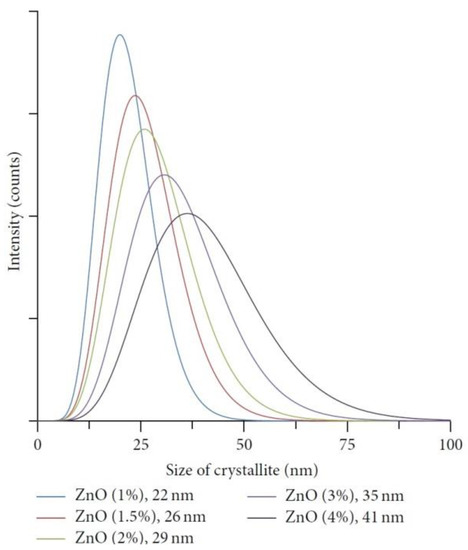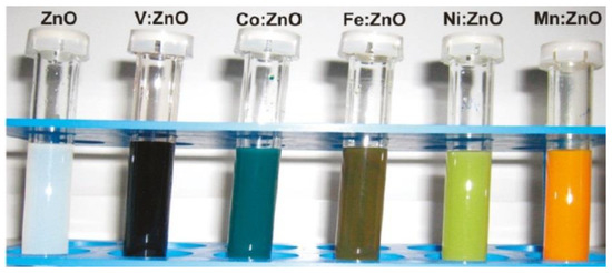The properties of nanostructures depend strongly on their size and shape [40,41,42,43,44,45,46,47,48,49,50]. The size-dependent effect of ZnO NPs has been observed on the: photocatalytic activity [337,338,339,340,341,342], catalyst activity [343], dielectric properties [344], piezoelectric property [345,346], breakdown voltage varistors [347], visible emission property of quantum dots displays [348], equilibrium constant of chemical reactions [349], gas sensing properties [350,351,352], thermal diffusivity of water nanofluid [353], photoluminescence [354], UV absorption [355,356], biomedical potential [357], toxicity [312,328,357,358,359,360,361,362], bioavailability [363], and interactions with biomatrices [364]. A nano ZnO material may be characterised by piezoelectric parameters of even a few times higher values than a bulk ZnO material [365]. The photoluminescence, band gap width, conductivity, or magnetic properties, in turn, may be controlled by doping ZnO NPs with transition metal ions (dopant quantity and type): e.g., Co, Mn, Cr, Ni, Fe, V) [74,223,224,225,226,227,228,229,230,231,232]. It was found that the UV sensing performance of doped ZnO improved in term of sensitivity and photoresponse properties compared to non-doped ZnO [366]. One of the goals of research concerning doped ZnO (diluted magnetic semiconductor—DMS) is to enable a combination of communication, memory, and data processing in a single device. They will serve for creating a new generation of smaller, faster and less energy-consuming devices than the present ones, acting based on a combination of conventional micro-electronics and spin-dependent effects [367,368].
