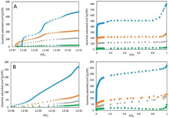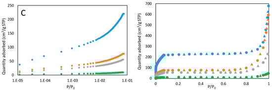 Adsorption (●) and desorption (▲) N2 isotherms (77 K). Basolite C300 (A), Basolite F300 (B) and Basolite A100 (C). Original sample (Blue), 55.9 MPa (Orange), 111.8 MPa (Grey) and 186.3 MPa (Green). The graphs on the left are zoom of the low pressure zone (up to P/P0 = 0.1) on logarithmic scale.