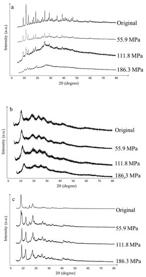 For pristine Basolite F300, a characteristic peak at 2θ = 11° is observed, despite the low resolution of the pattern as a consequence of the semiamorphous nature of the material and the elevated background values due to the iron fluorescence [54]. In fact, Basolite F300 is a distorted form of crystalline MIL-100(Fe) [55], and possesses a zeolite MTN topology [56]. In this case, the semiamorphous nature of the material just allows observing an increase of the amorphous matter with the pressure (Table 2). As it is a semiamorphous material, crystallinity is slightly reduced in relative terms [57], not reflected in the BET surface, which does not depend on crystallinity and is severely affected by increased pressure. Particle agglomeration causes the collapse of micropores, as it was demonstrated in Figure 4.