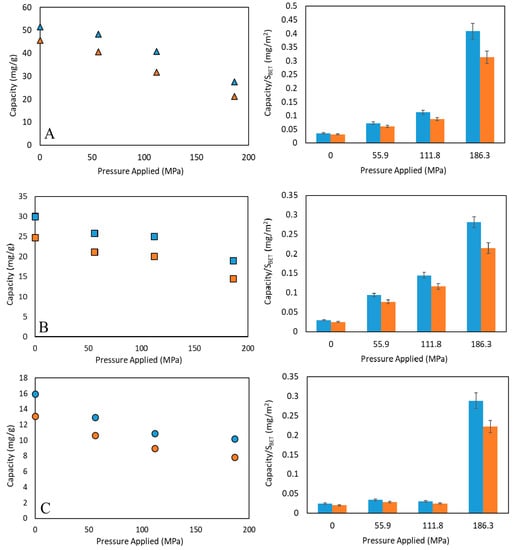 In the case of Basolite F300, a decreasing trend of the capacity of adsorption with the applied pressure is observed, the downward trend being more pronounced at the highest pressure (loss of 41.3% for N2 and 36.5% for CH4), Figure 6B. Adsorption capacity follows a similar trend to BJH total mesopore volume (Table 1), which could be related to its originally semi-amorphous properties, in which the adsorption capacity is not drastically reduced until a certain pressure limit. The accessibility to metal adsorption sites is maintained due to the appearance of mesopores and, thus, the intracrystalline diffusivity increases. This increase in accessibility is closely related to the smooth downward trend in adsorption capacity, showing an almost linear relationship with the specific available surface.
