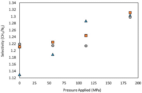From Figure 6 it is observed that the relative adsorption capacity decreases are higher for N2 than for CH4, and it may be related to metal adsorption centers being available, and more selective towards CH4 than N2 [70]. Thus, after surface area and total pore volume reduction, the available active metallic centers play a more relevant role in the selective gas adsorption, especially in Basolite C300 and A100 cases. The influence of the applied pressure in the CH4/N2 selectivity (mass basis) is shown in Figure 7. The increasing slope for Basolite C300 is markedly higher than for the other materials, due to the presence of a higher percentage of metal in its structure (31.5% of copper, vs. 21.2% and 12.9% of iron and aluminum for Basolite F300 and A100, respectively). Therefore, the higher metal content in the structure, the greater the selectivity-increasing trend with applied pressure.