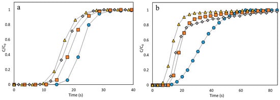 In the case of Basolite F300, all the samples, except the original one, show the same slope for breakthrough curves, but in this case the difference is lower than in C300 case. The original sample presents a more inclined breakthrough curve for both adsorbates, which indicates a lower Knudsen diffusion coefficient. Applied pressure modified the pore structure, plugging the micropores, but without reducing greatly the total pore volume by the appearance of mesopores that facilitate the penetration, so the differences in accessibility are softer (Figure 4). The high resemblance between the 55.9 and 111.8 MPa curves (Figure 8) is remarkable and can be related to the no-clear total mesopore volume dependence on pressure (Table 1). The appearance of mesopores in the structure enhance the intracrystalline diffusivity [74], which may be the dominant factor in this case, since the crystallinity is not great affected by mechanical pressure. Dhakshinamoorthy et al. have studied the high relevance of the intracrystalline diffusivity in this material, applied to the case of an oxidation reaction [75].