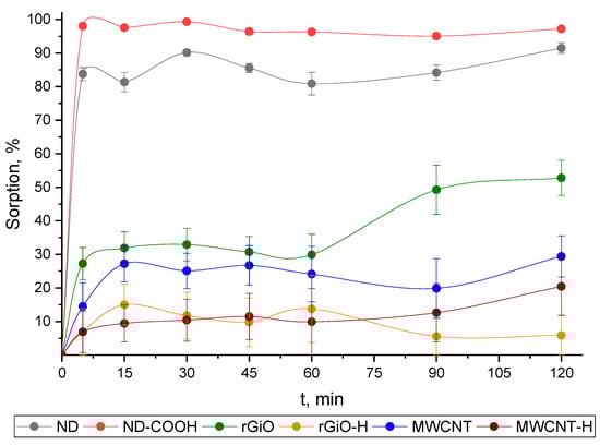 The kinetics of 68Ga sorption from aqueous solutions with pH 7 and m/V ratio of 100 μg/mL was studied on commercial CNMs (ND, rGiO and MWCNT) and their forms with surface modification, prepared in our experiments—oxidized ND (ND–COOH) and hydrogenated rGiO and MWCNT (rGiO–H and MWCNT–H); the results are presented in Figure 1. It was found that for ND and ND–COOH particles, sorption equilibrium is reached in 5 min and the degree of sorption of 68Ga is about 85 and not less than 95%, respectively. Sorption of 68Ga on the rGiO sample under studied conditions occurs more slowly than on ND and ND–COOH and sorption of only about 50% 68Ga is observed at 120 min, but sorption equilibrium is not achieved (Figure 1). On the samples rGiO–H, MWCNT and MWCNT–H, equilibrium is established within the first 5 min, but the maximum sorption of 68Ga does not exceed 30% for MWCNT and about 15% for rGiO–H and MWCNT–H in 120 min. Thus, of all CNMs studied in the work, only ND and ND–COOH have high sorption ability for 68Ga from aqueous solutions with pH 7.