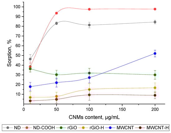 Earlier [] we determined the physicochemical properties of commercial and modified CNMs samples used in this research. The physicochemical properties of the nanoparticles were determined by high resolution transmission electron microscopy (HRTEM) (JEOL JEM-2100F/Cs/GIF (200 kV, 0.8 A), Tokyo, Japan), X-ray photoelectron spectroscopy (XPS) (Kratos Axis Ultra DLD, Manchester, GM, UK), dynamic light scattering (DLS) (ZetaSizer Nano ZS analyzer (633 nm) ZEN 3600, Malvern, Worcestershire, UK) and potentiometric titration; Table 1 summarizes the main characteristics of the CNMs used and more detail information is presented in Appendix A. It is seen from Table 1 that CNMs significantly differed both in structure and composition. Thus, NDs are spherical particles, rGiOs are nanoparticles of a flat structure and MWCNTs have a micron-sized filamentary structure with an internal cavity. In addition, the results of XPS and titration show changes in the composition of the surface of the samples after reactions (1) and (2). Thus, the oxygen content for ND–COOH increases by 2.2% compared with the ND sample and the content of carboxyl groups is also increased three times, which indicates the successful completion of the oxidation reaction and makes possible a difference in the sorption properties of ND and ND–COOH. Moreover, the size of aggregates in hydrosols varies slightly. As for the reduction process of rGiO and MWCNT, the oxygen content on the rGiO–H surface becomes significantly lower—by 11.6% and for MWCNT–H it decreases by only 0.4%. At the same time, the size of the aggregates for both rGiO–H and MWCNT–H undergoes significant changes, which indicates the influence of the hydrogenation process on the structure and suggests some difference in sorption properties.