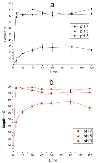 It was shown that ND and ND–COOH efficiently sorb 68Ga from a solution of pH 7 (Figure 1 and Figure 2) and then, the influence of pH of initial solution 68Ga on the efficiency of its sorption onto ND and ND–COOH was studied. The obtained data on the 68Ga sorption from aqueous solutions with pH 1, 3, 5 and 7 are shown in Figure 3. It was demonstrated that at pH 5 the degree of sorption of 68Ga for both CNMs samples decreased slightly (about 5%) compared to pH 7, while at pH 3 there was a significant decrease in sorption of 68Ga onto ND to 25% in 120 min and sorption onto ND–COOH also decreases—to 75% at the same time. In addition, sorption on both CNMs samples at pH 3 slows down and equilibrium is achieved by mixing the phases in 45 min, while at pH 5 and 7—in 5 min. At pH 1, as shown by our studies, 68Ga sorption is not observed on both samples for 120 min.