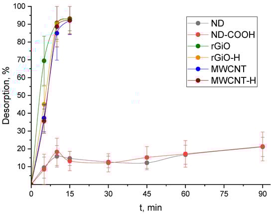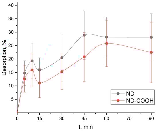 As can be seen from the data in Figure 4, the lowest degree of desorption of 68Ga is observed for ND and ND–COOH, which reaches 20% in 90 min and is acceptable for using developed conjugates (68Ga@CNMs). For rGiO, rGiO–H, MWCNT and MWCNT–H, quantitative desorption of 68Ga occurs in 15 min, which indicates the impossibility to use these CNMs as carriers of 68Ga in RPs. In this regard, the influence of temperature of 37 °C to stability was studied for 68Ga@ND and 68Ga@ND–COOH conjugates. As follows from the data in Figure 5, an increase in the temperature of the stripping solution from 25 to 37 °C leads to a change in the degree of desorption of the radionuclide from 20% to 30% in 90 min.