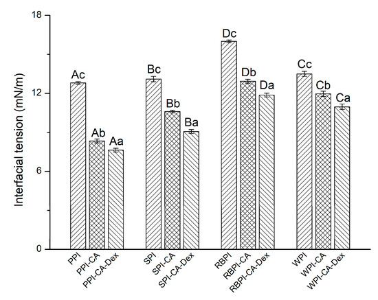 It could be seen from Figure 3 that the interfacial tension of the PCD conjugates were significantly lower than each PC conjugates (p < 0.05). Among four PCD conjugates, PPI-CA-Dex had the smallest interfacial tension (7.63 ± 0.15 mN/m), while the RBPI-CA-Dex had the largest interfacial tension (11.87 ± 0.15 mN/m). In fact, after the addition of dextran, the dextran could further crosslink with the PC conjugates, leading to the partial unfolding of the protein at the adsorption layer. Thus, dextran induced further unfolding of the protein, as analyzed in FT-IR result, allowing for it to be more efficiently adsorbed at the oil-water interface. Subsequently, thicker viscoelastic membranes were formed with the reduction of the interfacial tension [38].