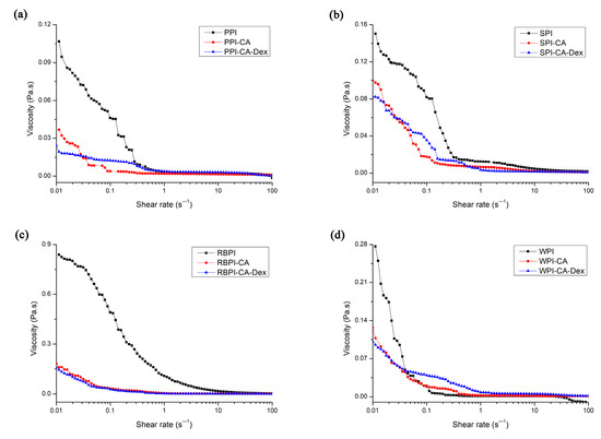 The apparent viscosity of nanoemulsions stabilized by NP, PC, and PCD samples. (a) represented the apparent viscosity of nanoemulsions stabilized by PPI, PPI-CA and PPI-CA-Dex; (b) represented the apparent viscosity of nanoemulsions stabilized by SPI, SPI-CA and SPI-CA-Dex; (c) represented the apparent viscosity of nanoemulsions stabilized by RBPI, RBPI-CA and RBPI-CA-Dex and (d) represented the apparent viscosity of nanoemulsions stabilized by WPI, WPI-CA and WPI-CA-Dex.