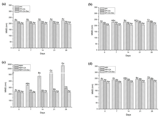 The MDD of nanoemulsions stabilized by NP, PC, and PCD samples under different storage weeks. (a) represented the MDD of nanoemulsions stabilized by PPI, PPI-CA and PPI-CA-Dex under different storage weeks; (b) represented the MDD of nanoemulsions stabilized by SPI, SPI-CA and SPI-CA-Dex under different storage weeks; (c) represented the MDD of nanoemulsions stabilized by RBPI, RBPI-CA and RBPI-CA-Dex under different storage weeks; (d) represented the MDD of nanoemulsions stabilized by WPI, WPI-CA and WPI-CA-Dex under different storage weeks. A–D represented that there were statistically differences (p < 0.05) in MDD in different storage time of same samples, a–c represented that there were statistically differences (p < 0.05) in MDD in same storage time of different samples.