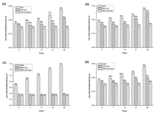 The thiobarbituric acid-reactive substances (TBARS) values of nanoemulsions stabilized by NP, PC, and PCD samples under different storage weeks. (a) represented the TBARS values of nanoemulsions stabilized by PPI, PPI-CA and PPI-CA-Dex under different storage weeks; (b) represented the TBARS values of nanoemulsions stabilized by SPI, SPI-CA and SPI-CA-Dex under different storage weeks; (c) represented the TBARS values of nanoemulsions stabilized by RBPI, RBPI-CA and RBPI-CA-Dex under different storage weeks; (d) represented the TBARS values of nanoemulsions stabilized by WPI, WPI-CA and WPI-CA-Dex under different storage weeks. A–D represented that there were statistically differences (p < 0.05) in TBARS values in different storage time of same samples, a–c represented that there were statistically differences (p < 0.05) in TBARS values in same storage time of different samples.