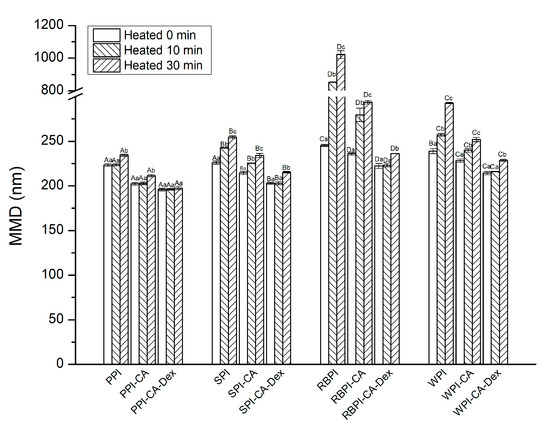 The MDD of nanoemulsions stabilized by NP, PC, and PCD samples after heating treatment. A–D represented that there were statistically differences (p < 0.05) in MDD among nanoemulsions stabilized by four NPs, four PCs or four PCDS in same heat conditions; a–c represented that there were statistically differences (p < 0.05) in MDD among same samples in different heat conditions.