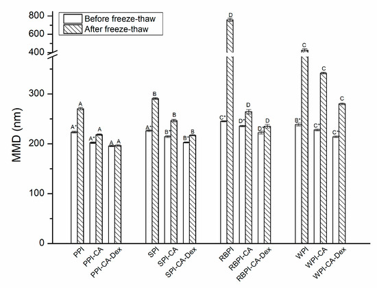 The MDD of nanoemulsions stabilized by NP, PC, and PCD samples after freeze-thaw treatment. A–D represented that there were statistically differences (p < 0.05) in MDD among nanoemulsions stabilized by four NPs, four PCs or four PCDS. * represented that there were statistically differences (p < 0.05) in MDD between same samples after freeze-thaw treatment.