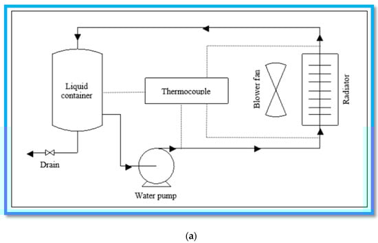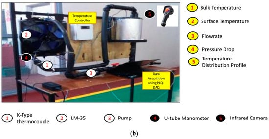 The testing of all the prepared nanofluids was carried out using a radiator test rig setup. The schematic diagram of the used radiator test ring is shown in Figure 2a,b. A 24 V DC supply was used as the main power source for the pump and heater. The radiator test rig was a closed loop system where the water circulated in the system by water pump. There were K-Type thermocouples (1.5 mm, USA) at four points on the radiator wall to measure the surface temperature of the radiator. A 12 V cooling fan (I-COOL, Japan) was attached to the radiator which acts as a normal radiator fan like a readily available automobile radiator. The heat produced by an automobile system during its routine was imitated by a 1kW heater (Dernord, USA). The volume of the essential coolant fluids was 4 L, composed of nanofluid and distilled water and stored in a 5 L metal tank.