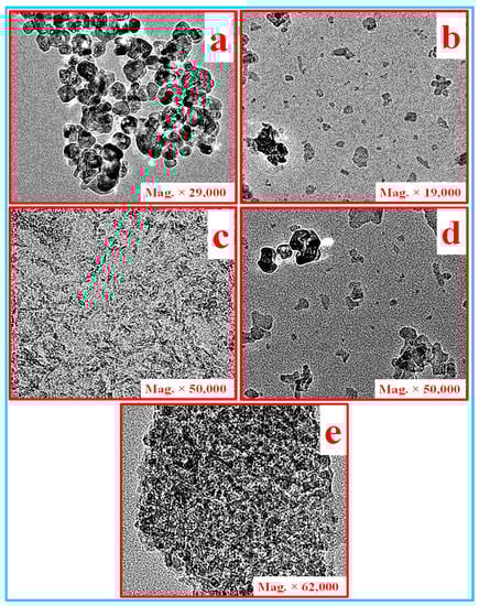 A transmission electron microscope (TEM) was used to acquire the high-resolution images of Al2O3, CNC, TiO2, TiO2 + Al2O3 and Al2O3 + CNC in the nanofluid with a high magnification and the results are shown in Figure 3a–e, respectively. However, the contrast and resolution were limited while acquiring the image of Al2O3 and CNC which may be due to low electron densities and a low profile [,]. Figure 3a shows the TEM image of the dispersed TiO2 nanoparticles into the ethylene glycol–water mixture (EG–W) fluid which illustrates that primary TiO2 particles have an almost uniform morphology and are interconnected to each other. However, the particles seemed to be nearly homogeneously dispersed in the base fluid. The TEM image of the Al2O3 nanoparticles dispersed evenly into the base fluid is displayed in Figure 3b which illustrates that the particles are almost uniformly dispersed in the base fluid with very small aggregation. The TEM micrograph of the CNC nanoparticles dispersed in base fluid is represented in Figure 3c. It can be clearly seen that the CNC nanoparticles completely homogeneously dispersed in the fluid, which is the one of the main requirements of the present application. Figure 3d,e shows the TEM micrographs of the Al2O3/TiO2 and Al2O3/CNC hybrid nanofluids, respectively. It can be observed that the dispersion of the Al2O3 and TiO2 nanoparticle is approximately uniform in the base fluid, however, both types of nanoparticle were not completely interconnected to each other. On the contrary, it can be clearly seen in Figure 3e that the Al2O3/CNC hybrid nanofluids were dispersed uniformly in the fluid. Furthermore, the Al2O3 and CNC nanoparticles were completely interconnected to each other i.e., the agglomerated particles which resulted in strong stability enhancement. Philip, Shima [] reported that the formation of the agglomerated particles in the nanofluid basically depends upon on the surface contact between the particles. A strong van der Waals force works between the agglomerated particles which is very hard to break it into primary nanoparticles.