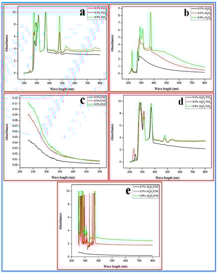 UV spectrum of (a) TiO2, (b) Al2O3, (c) CNC, (d) Al2O3/TiO2 and (e) Al2O3/CNC nanofluids with various concentrations.