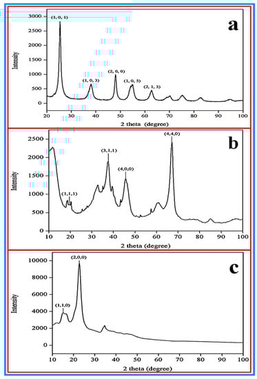The crystal structure information of all the samples was collected by recording and analyzing the obtained XRD patterns. The XRD patterns of the TiO2, Al2O3 and the CNC nanoparticles are shown in Figure 4a–c, respectively. The XRD pattern of TiO2 is displayed in Figure 5a where all the characteristic peaks i.e., at 2θ angles of 25.28°, 37.93°, 48.37°, 53.88° and 62.72° correspond to the (101), (103), (200), (105) and (213) respectively, are in good agreement with the standard XRD pattern (ICDD no. 00-001-0562) and consistent with what was reported by Al-Taweel and Saud [], which is portrayed in Figure 6. Figure 4b shows that the alumina phase which was identified at 2θ values of 19.4°, 37.7°, 45.8° and 66.8° which correspond to the diffraction from the (111), (311), (400) and (440) crystal planes, respectively; these results agreed with the standard XRD pattern (ICDD, PDF no. 01-074-2206 (Al2O3) 5.3333 Aluminum Oxide) according to []. The XRD pattern shown in Figure 4c reveals the pure phase of the CNC (C6H10O5)n Cellulose-1ß)) nanoparticles where most intense peaks at 2θ angles of 16.6° and 22.9° correspond to the (1, 1, 0) and (2, 0, 0) crystal planes, respectively, and other peaks are well-matched with the standard XRD pattern (ICDD no. 00-056-1718) and in accordance with Kumar, Negi [], which is shown in Figure 7.
