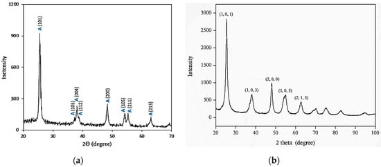 Comparison of the XRD patterns of the TiO2 nanoparticles from (a) Al-Taweel and Saud et al. [] and (b) the current study. Figure 6a is reproduced with permission from [Al-Taweel, S.S.; Saud, H.R. New route for synthesis of pure anatase TiO2 nanoparticles via ultrasound assisted sol-gel method, Published by (J. Chem. Pharm. Res.) 2016].