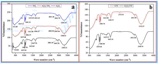 FTIR spectra of (a) TiO2, Al2O3, Al2O3/TiO2 (hybrid) nanofluids, and (b) CNC mono and Al2O3/CNC hybrid nanofluid.