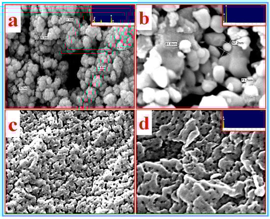FESEM was used to investigate the surface morphological properties of all the samples and the results are shown in Figure 9a–d. From the FESEM image of the TiO2 nanoparticles (shown in Figure 9a), the shape of the individual particles is spherical with a diameter below 50 nm. These nanoparticles combined to form bigger particles which look like they are loosely bound or not properly agglomerated. Furthermore, the EDX analysis (inset) indicates the presence of Ti and O atoms in the sample. Figure 9b and the inset represents the FESEM image and the corresponding EDX pattern of the Al2O3 nanoparticles, respectively. The FESEM image depicts that primary particles are almost spherical in shape. These nanoparticles interconnected to each other form large particles (microparticles) that have irregular shapes. The small and bigger particles have diameters in the range of 50–90 nm and 1–5 µm, respectively. Furthermore, the elemental analysis of these particles confirms the presence of Al and O in the nanoparticles (inset). On the other hand, CNC was in the gel form which makes it difficult to analyze the morphological properties using FESEM. Therefore, two samples (i.e., film and powder) of CNC were prepared by drying for the FESEM analysis and the obtained results are shown in the inset of Figure 9c,d. It can be observed from both figures that no individual nanoparticles could be seen in both samples. However, the particles interconnected with each other formed a porous morphology which looks like a net. Nonetheless, the EDX analysis (inset of Figure 9d) confirmed the presence of the C and O atoms in the CNC nanoparticles.