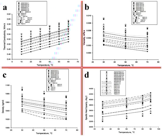 (a) Thermal conductivity of all the nanofluids vs. the temperature plot; (b) viscosity with respect to the temperature; (c) density comparison as a function of the temperature and the volume; and (d) comparison of the specific heat capacity of the mono and hybrid nanofluids with various volume concentrations.