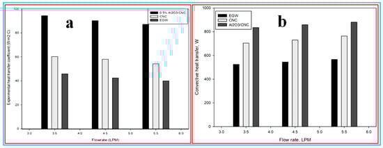 The obtained average experimental heat transfer coefficient as a function of the flow rate in (LPM unit) is shown in Figure 11a. It was observed from the figure that the experimental heat transfer coefficient for Al2O3/CNC, CNC and EG–W were found to be 94.93, 60.28 and 45.84 W/m2 °C at a 3.5 LPM flow rate and these values decrease up to 90.22, 57.98 and 42.5 W/m2 °C at a 4.5 LPM flow rate, respectively. The values of the experimental heat transfer coefficient for Al2O3/CNC, CNC and EG–W goes further down up to 87.23, 54.23 and 40.02 W/m2 °C at 5.5 LPM, respectively. It can be concluded from the obtained results that the experimental heat transfer coefficient directly depends upon the relation with the flow rate. Similar results have also been observed by Ali, Ali []. Namburu, Das [] also investigated the heat transfer performance in a radiator test rig for an EG–W mixture with dispersed copper oxide (CuO) and reported that the heat transfer coefficient boosted up to 1.35 times more than the base fluid at a 20,000 Reynolds number. Moreover, the fan produced a drastic increment in the heat transfer coefficient value compared to the without a fan circumstance. The abnormal behavior in the high-transfer coefficient value of the Al2O3/CNC nanofluid can be better correlated with the high specific heat capacity and the thermal conductivity of the Al2O3/CNC rather than the CNC and EG-W. Generally, the rate of heat transfer affects the heat removal application. Therefore, the observed high relative heat transfer coefficient value indicates that the better heat removal can be obtained in Al2O3/CNC rather than CNC and EG-W at a low volumetric flow rate. Besides, the heat transfer coefficient value with the influence of a fan has a higher value than in circumstances without a fan. Indeed, the air velocity used during the measurement accelerates the rate of the heat removal in the radiator test rig.