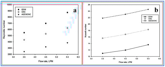 (c) Reynolds number: the Reynolds number is an important factor and it needs to be calculated to identify the type of flow regime in the radiator test rig. The Reynolds number was calculated using Equation (9) and the calculated Reynolds number as a function of the plotted flow rate is shown in Figure 12a. The results revealed that the maximum/minimum Reynolds number was calculated for Al2O3/CNC, CNC and EG–W which are 3852.32/2433.42, 6234.54/4329.43 and 8741.12/5483.83 at 5.5/3.5 LPM, respectively. From the results, it can be seen that the Reynolds number for all the above nanofluids have a proportional relation with the flow rate i.e., the Reynolds number increased when the flow rate was rising. Therefore, it can be concluded that the flow regime achieved by the Al2O3/CNC, CNC and EG–W can be considered as turbulent and remains similar inside the radiator at a varying flow rate between 3.5 and 5.5 LPM. The almost identical trend of the Reynolds number was also observed by Ali, Ali [] for a ZnO nanofluid. Furthermore, Heris, Esfahany [] has also investigated the properties of an Al2O3 nanofluid and obtained a lower value for the Reynolds number than for the base fluid. Basically, a low Reynolds number is more likely to correlate with the impact of a high viscous force than the inertial force in the nanofluid []. Therefore, the low value of the Reynolds number of the CNC may be due to the high dynamic viscosity value rather than the EG–W. Furthermore, the high density in the CNC results of the high inertial effect on the nanofluid plays an important role in determining the Reynolds number. In view of this, the Reynolds number increases with the flow rate which can be explained by the proportional relation of the Reynolds number to velocity: