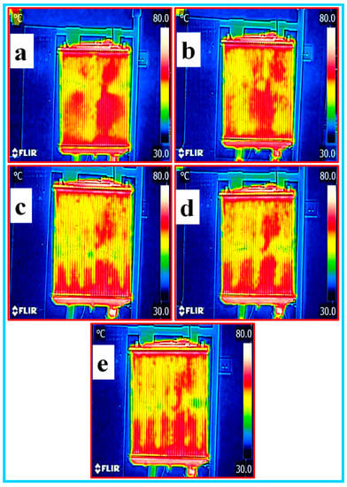 Thermal imaging of the base fluids (ethylene glycol–water mixture (EG–W)) in the radiator (a–e).
