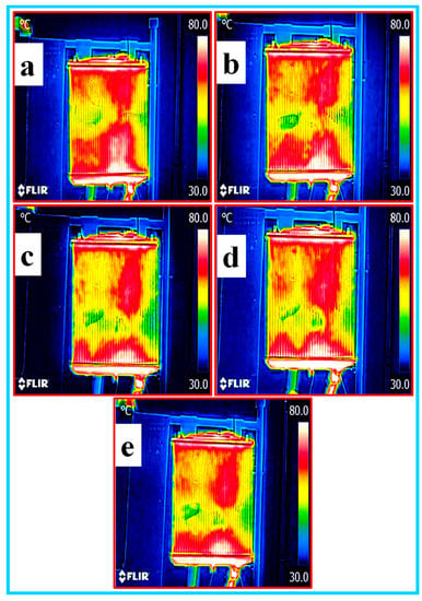 Thermal imaging of the CNC with a 0.5% volume concentration in the radiator (a–e).