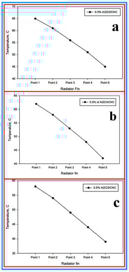 (d) Temperature at radiator fin: as per the above discussion, 0.5% volume concentration Al2O3/CNC was found to be better than the CNC and EG–W in terms of thermal heat properties, therefore, it was selected for further analysis. For the measurement, five points were chosen at the radiator fin to analyze the temperature at three different flow rates. This temperature was selected to get the average temperature on the fins. The temperature values at the 3.5, 4.5 and 5.5 LPM flow rates are shown in Figure 16a–c, respectively. It was observed that point 5 has less temperature compared to point 1. This was due to the heat transfer process occurring in the fins where the temperature is reduced.