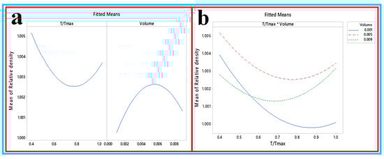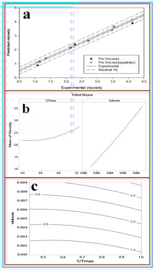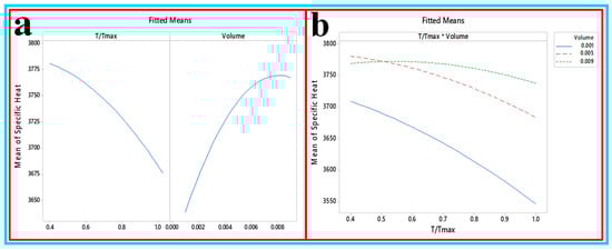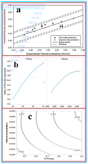 (a) Development of first and second order of thermal conductivity of CNC/Al2O3 using RSM: the effect of the considered factors on the compressive behavior of the samples was investigated by performing an analysis of variance (ANOVA) and the results are tabulated in Table 4. The objective of the ANOVA table is to investigate the importance of the parameters on the experiments. The model generated can be saved for future experimental process. The model can also predict the values of the response without running extra experiments. Basically, the ANOVA table was generated from the Minitab software. However, the main fundamental condition for obtaining it was the statistical equations that generated the values. The investigating factors are the temperature and the volume concentration, whereas the output factor was the thermal conductivity. The obtained p-value revealed the impact of the term. The level of the significant set to 0.05 permits choosing the parameters whose impact is not insignificant from a measurable perspective []. It shows that the temperature and volume concentration significantly affect the thermal conductivity. The temperature shows the dominant effect on the thermal conductivity since it contributed 50.46% and followed by volume 20.30% as shown in the ANOVA Table 4. These findings support that the particles are capable of transferring heat directly from one to another at a high temperature: the higher the kinetic energy at a high temperature, the more the rate of heat transfer increases. Figure 17a shows the predicted thermal conductivity with a 2–4% error. It shows that the quadratic equation predicts more closely compared with the linear equation. The contour plot and the factorial plot show in Figure 17b,c that the thermal conductivity increase with the increase in temperature and volume. The first-order and quadratic equation to predict the thermal conductivity are shown in Equations (12) and (13):