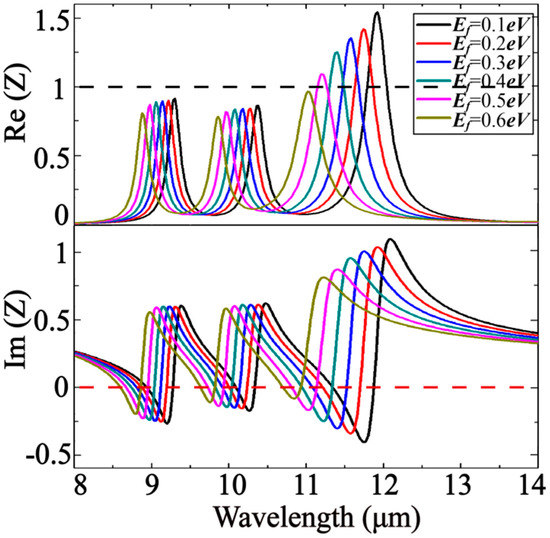 The relationship between the normalized impedance and the energy of Fermi level is investigated in Figure 5 to predict the absorptance properties when the graphed doping level is changing. As the Fermi level increases, the real and imaginary parts of the normalized impedance decrease slightly, and the resonance wavelength appears blue shifted. From this, we can see that as the Fermi level increases, the resonance wavelength of the absorber should appear blue shifted.