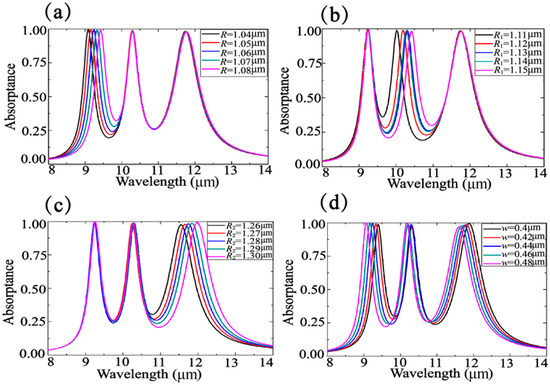 (a–d) Absorption spectra analysis with varying R, R1, R2, and w, respectively. Other parameters are set as default.