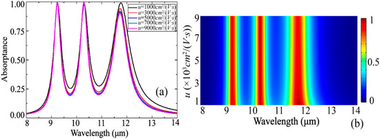 The analysis of the change in the carrier mobility u in Figure 7 shows that when u increases, the first two absorptance peaks increase slightly, and the third absorption peak decreases significantly. This behavior is different from some previous patterned graphene multi-band absorbers [31,45]. We speculate that there is an interaction between the resonance absorption of the three metal rings and the single-layer graphene, thus forming such a changing behavior.