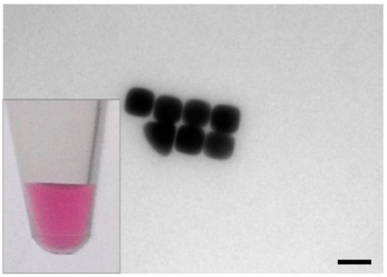 TEM image of gold nanocubes, which show a bright pink color in colloidal solution (inset: photograph of nanocube solution). The gold nanocubes had a size of 49.4 ± 5 nm with a surface area of 0.0146 µm2, scalebar: 50 nm.