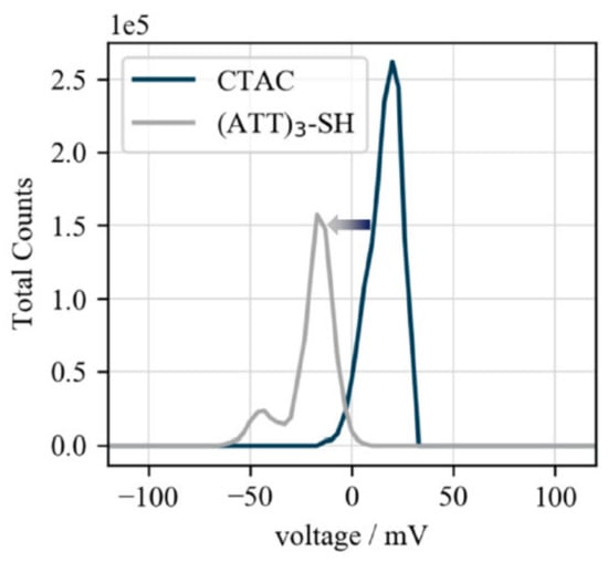 The successful particle functionalization was further confirmed by ζ potential measurements. As the CTA+ ligands are positively charged, nanoparticles capped with these ligands possess a positive ζ potential, whereas following DNA-functionalization, a negative ζ potential is expected due to the negative DNA backbone. Thus, a ζ potential shift from positive (+20 mV) to negative (−17 mV) confirms the success of biofunctionalization (Figure 4).