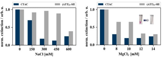 Figure 5 illustrates the results of the aggregation experiments conducted with gold nanocubes, by monitoring the loss in extinction (color) of the colloidal particle solutions. CTAC-capped gold nanocubes (blue bars) aggregated right upon addition of salt. The DNA-capped gold nanoparticles (grey bars) expressed higher salt stability compared to their CTAC-capped counter parts but aggregated nevertheless when subjected to MgCl2 concentrations above 10 mM (additional spectra are given in Appendix B Figure A1).