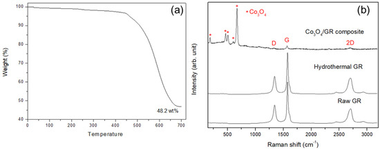 (a) Thermo-gravimetric analysis (TGA) results for the as-prepared Co3O4/GR composite, and (b) Raman spectra of the pristine GR sheets, hydrothermal treated GR, and Co3O4/GR composite.