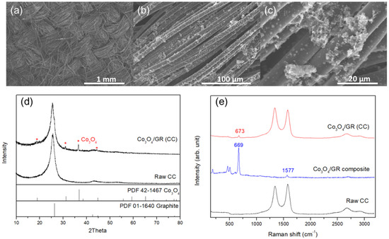 (a–c) SEM images at different magnifications of the air cathode consisting of carbon cloth loaded with the Co3O4/GR composite, (d) XRD patterns of the as-prepared air cathode with or without the Co3O4/GR composite, and (e) Raman spectra of the raw carbon cloth (CC), Co3O4/GR composite, and carbon cloth (CC) with the Co3O4/GR composite.