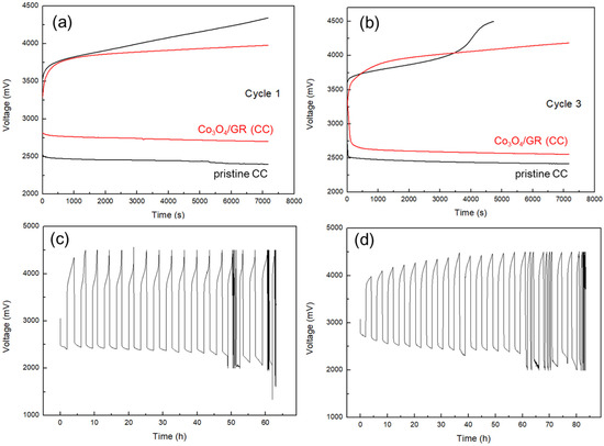 The discharge/charge voltage profiles for HELABs with an air cathode of Co3O4/GR (CC), along with control pristine CC on (a) cycle 1 and (b) cycle 3. (c) The cycling voltage profiles for HELABs containing a carbon cloth (CC) cathode without and (d) with Co3O4/GR. All the batteries were operated at 0.05 mA cm−2 under ambient air with a limited capacity of 100 mAh g−1.