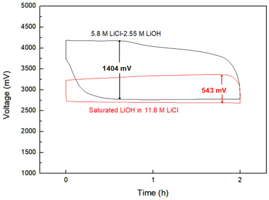 In a recent review, Lai et al. [13] reported that the addition of LiCl was used to adjust the alkalinity and increase the conductivity of a LiOH solution, while Adam et al. [54] proposed that the excessive concentration of Li+ may impede the activity of cathodic catalysts. Additionally, the saturated LiOH in 11.6 M LiCl was chosen as aqueous electrolyte for comparison with 5.8 M LiCl-2.55 M LiOH. The HELAB voltage profiles employing two electrolytes are shown in Figure 7. The HELAB employing the saturated LiOH in 11.6 M LiCl displayed a very low over-potential of 543 mV, compared to that of the unsaturated aqueous solution (1404 mV). The over-potential was drastically reduced by nearly 61%, reaching a round-trip efficiency of 83%. This considerable improvement is attributed to the saturated LiOH in 11.6 M LiCl solution, making the charging reaction occur much more easily. A previous study [55] discovered that a high concentration of lithium ions would suppress the dissociation of LiOH to the ions of Li+ and OH−. Apart from supplementing Li+, Adam’s results also indicated that the use of LiCl can mediate Li2CO3 formation [54]; however, the role of Cl− is still unclear at this state. The pH value of our saturated LiOH in 11.6 M LiCl was measured to be 9.43, so the reaction product LiOH does not dissociate to ions in the LiCl saturated aqueous solution. Thus, the necessary reactant of the non-dissociated state LiOH was sufficient in the aqueous electrolyte for the charge reaction. Then, the charge reaction was to spontaneously occur according to Le Chatelier principle, leading to an obvious reduction in the over-potential. This finding was crucial for an innovative strategy that effectively minimizes polarization for HELAB application using an aqueous solution. The equilibrium voltage (average of charge and discharge voltages, approximately 2.9–3 V) after employing the saturated LiOH in 11.6 M LiCl was lower than that when employing the former (approximately 3.4 V). The decline in the equilibrium voltage may be explained by the fact that the cathodic reaction tends to follow the two-electron mechanism instead of four-electron mechanism when using the saturated LiOH in 11.6 M LiCl [54]. Particularly, the discharge equilibrium voltage when employing the saturated LiOH in 11.6 M LiCl is lower than that with the dilute counterpart, suggesting the two-electron mechanism as a possible cell mechanism. Adam et al. [54] suggested that this may be attributable to low O2 solubility in concentrated solution, promoting peroxide formation. The concentrated solution may impede the cathode’s catalytic activity. Interestingly, even though the cell reaction may be dependent on two-electron mechanism, tremendous enhancement can be seen in Figure 7. Therefore, the advantages of saturated LiOH in the 11.6 M LiCl should outweigh the disadvantages. Regarding the long-term stability, a continuous flow of electrolyte should be used to refresh the possible formation of peroxide and other deposits. Overall, saturated LiOH in 11.6 M LiCl served as an effective strategy to improve the efficiency of the assembled HELABs.