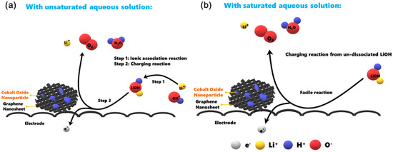 For the charging process, the ionic association of solvated Li+ and OH− ions (i.e., the reverse reaction in Equation (2)) should be, in general, prior to the charging reaction (the reverse reaction in Equation (1)). The entire charging process would include the two steps mentioned above when the HELAB is operated in an unsaturated aqueous electrolyte solution (Figure 8a). However, by effectively suppressing the dissociation of solvated LiOH, the presented saturated LiOH in 11.6 M LiCl offered a facile reaction route to expedite the charging reaction through a single-step route (Figure 8b). As a result, the superior enhancement may be explained in terms of a highly reversible reaction for Equation (1). The unnecessary reaction Equation (2) could be greatly removed as saturated LiOH in 11.6 M LiCl was employed, leading to the suppression of dissociation. The reaction mechanism is interesting and plays a positive role in aqueous Li/air batteries [56,57]. Furthermore, the employed saturated LiOH in 11.6 M LiCl also led to a different cell reaction pathway, because the equilibrium voltage of the HELAB is different from that with the unsaturated aqueous solution, being an average of 524 mV lower (Figure 7, from the difference in average voltage values of the first discharge and charge cycles). This result could be attributed to the changes in the OER mechanisms. Adam et al. [54] proposed a two-electron ORR mechanism at the discharge stage. For the OER reaction at the charge cycle, either a two-electron mechanism (with a standard voltage of 2.96 V) or a four-electron mechanism (with a voltage of 3.44 V) is possible. By suppressing the dissociation of the solvated LiOH, the HELAB operated under saturated LiOH in 11.6 M LiCl is expected to follow the two-electron OER mechanism. This pathway would significantly reduce the OER equilibrium potential, resulting in a lowered charge voltage profile, as shown in Figure 7. In the past, Adam et al. [54] used 5.0 M LiOH and 10 M LiCl separately for different aqueous electrolytes, pointing out that a concentrated solution may impede catalytic performance. Contrarily to their results, hybrid electrolyte LiCl-LiOH solutions are employed in this work, while saturated LiOH in 11.6 M LiCl displays a superior round-trip efficiency of 83% using a synthesized Co3O4/GR composite under ambient air. The enhancement is likely ascribed to the suppression of LiOH dissociation, significantly facilitating the charge reaction. More importantly, Co3O4/GR fit in very well in this system. This finding is interesting because it opens up a new strategy for aqueous Li/air batteries utilizing alkaline-stable catalysts in an alkaline environment.
